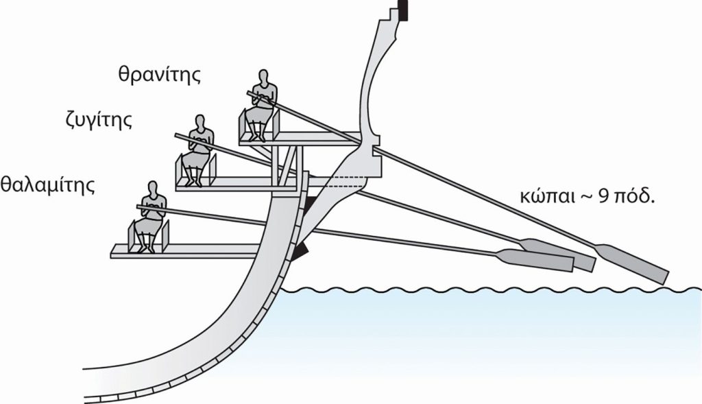 Μέρος αυτής της τεχνολογίας ήταν και η προσθήκη μιας ακόμη σειράς κωπηλατών μέσω μιας ιδιοφυούς κατασκευής: «Από τον 9ο αιώνα π.Χ. οι Ελληνες είχαν χρησιμοποιήσει “δικρότους” ναυς, δηλαδή πλοία με δύο αλληλυπέρθετες σειρές κωπηλατών. Η περαιτέρω αύξηση ισχύος και ταχύτητας ενός τέτοιου πλοίου μέσω τρίτης σειράς κωπηλατών δεν θα μπορούσε να επιτευχθεί με αύξηση του ύψους του σκάφους με ένα τρίτο κατάστρωμα.