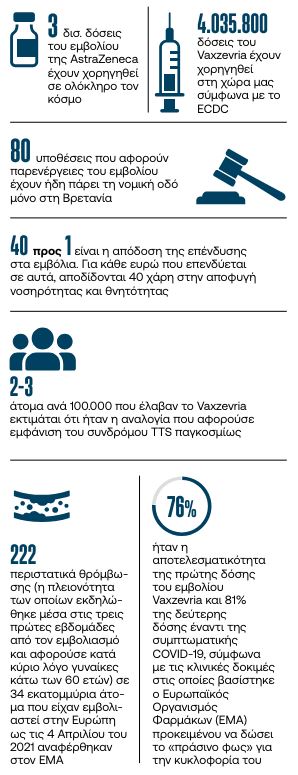 Ηταν όμως μόνο αυτός ο λόγος της απόσυρσης ή έπαιξε ρόλο το ότι προσφάτως διέρρευσαν στη Βρετανία δικαστικά έγγραφα στα οποία η εταιρεία παραδεχόταν τη σύνδεση του εμβολίου με τη σπάνια αλλά υπαρκτή παρενέργεια του συνδρόμου ΤΤS (σύνδρομο θρομβώσεων με θρομβοπενία, δηλαδή με χαμηλό αριθμό αιμοπεταλίων); Να σημειωθεί ότι μόνο στη Βρετανία έχουν ήδη πάρει τη νομική οδό τουλάχιστον 80 υποθέσεις που αφορούν παρενέργειες του εμβολίου (ενώ τέτοιες υποθέσεις αναμένεται να εκδικαστούν και στη χώρα μας).