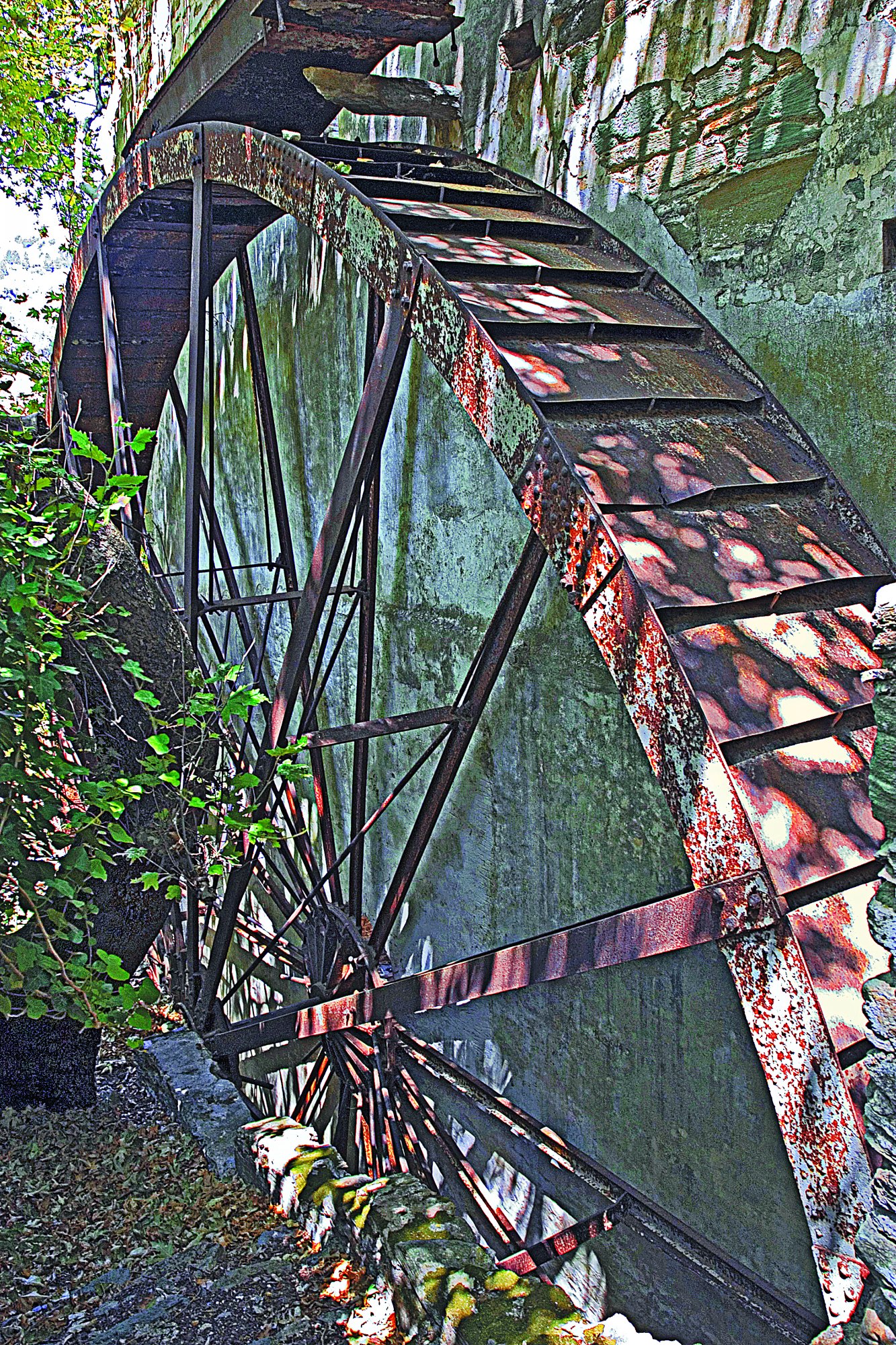Η μεγάλη φτερωτή στην (εγκαταλελειμμένη) Φάμπρικα στις Στενιές της Ανδρου. Η κατασκευή σηματοδοτεί κατά κάποιον τρόπο το πέρασμα από την προβιομηχανική στη βιομηχανική εποχή στην Ελλάδα