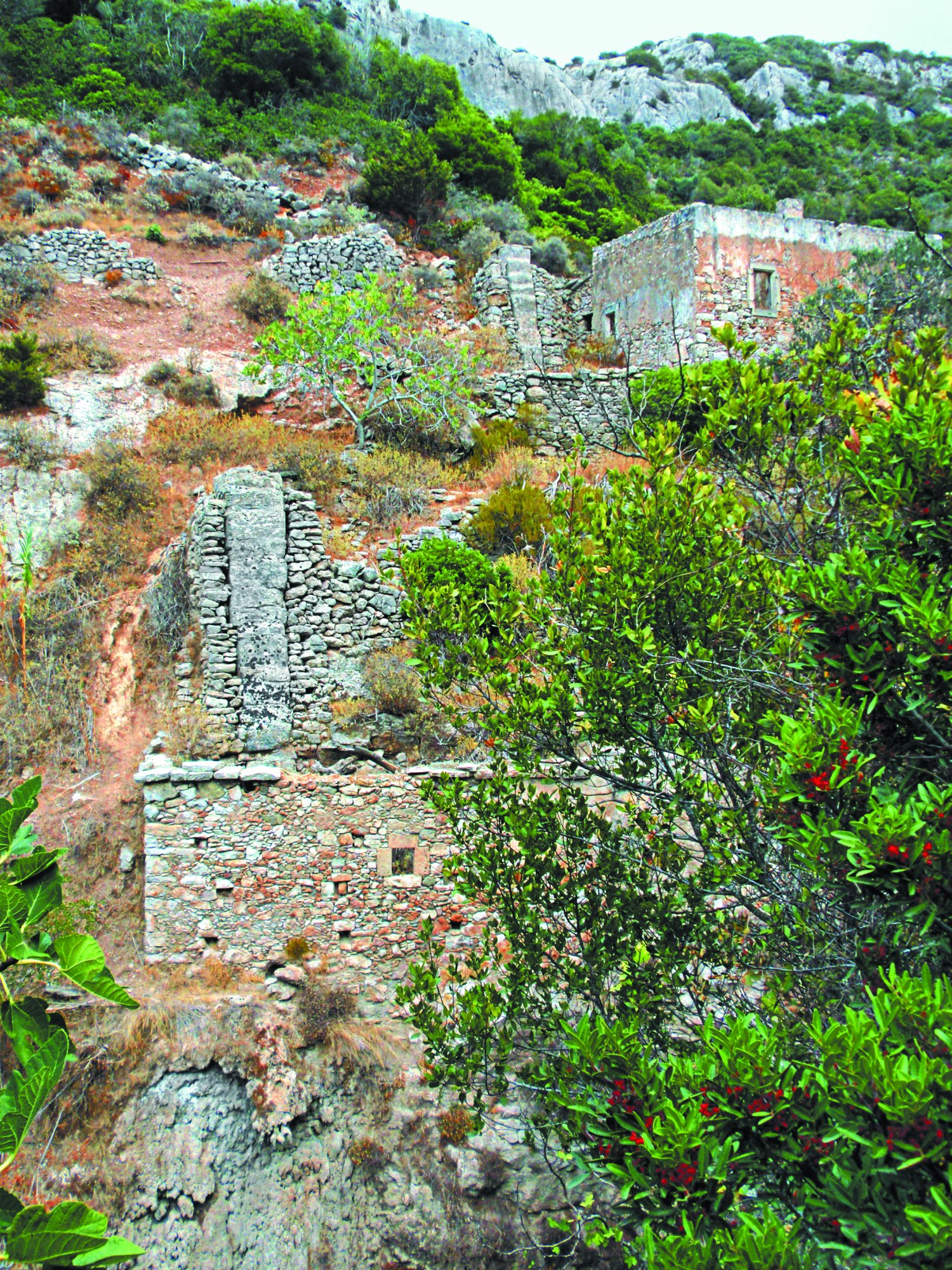 Απομεινάρια επάλληλων μύλων στα Κύθηρα. Το νερό που περνούσε από τον ψηλότερο τροφοδοτούσε και τον κάτω