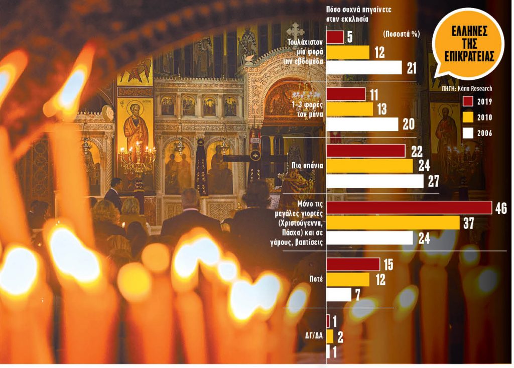 Στο διεθνές αυτό «θρησκειολογικό φόντο», οι Ελληνες θεωρούν σε μεγάλα ποσοστά πολύ σημαντική τη θρησκεία στη ζωή τους. Ωστόσο, παρότι το θρησκευτικό μας συναίσθημα μας προσδιορίζει ιστορικά ως έθνος, τα τελευταία χρόνια εμφανίζονται μεγαλύτερα ποσοστά πολιτών που φαίνεται ότι κρατούν αποστάσεις από την «ιερότητα». Η εικόνα αυτή αποτυπώνεται στις τελευταίες έρευνες κοινής γνώμης (νεότερη εκείνη της ΔιαΝΕΟσις που παρουσιάστηκε πριν από έναν χρόνο), στην οποία φαίνεται ότι το 78,7% των Ελλήνων πιστεύει στον Θεό, το 53,4% αισθάνεται πολύ κοντά στη θρησκεία και ένας στους τρεις Ελληνες πηγαίνει στην εκκλησία τουλάχιστον μία φορά τον μήνα.