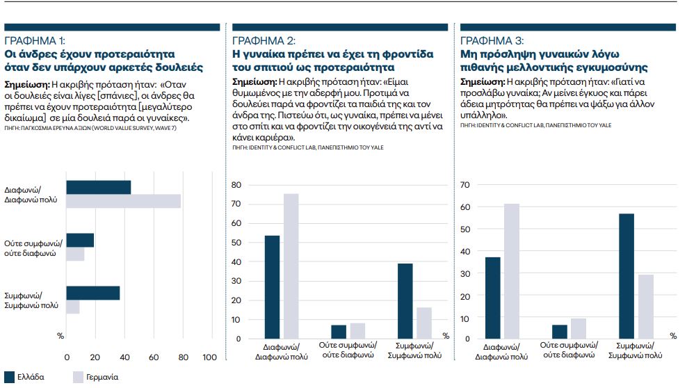 Συγκριτικά με άλλες ευρωπαϊκές χώρες, τα δεδομένα υποδηλώνουν ότι η Ελλάδα υστερεί σημαντικά όσον αφορά τη δέσμευση των πολιτών της στην ισότητα των φύλων. Για παράδειγμα, σύμφωνα με την Παγκόσμια Ερευνα Αξιών (WVS), ενώ μόλις το 9% των Γερμανών συμφωνεί πολύ ότι οι άνδρες πρέπει να έχουν προτεραιότητα έναντι των γυναικών όταν οι δουλειές είναι λίγες, το αντίστοιχο ποσοστό στην Ελλάδα προσδιορίζεται στο 37% (Γράφημα 1).