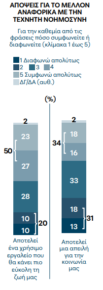 Το 50% φαίνεται να θεωρεί ότι η ΤΝ αποτελεί ένα χρήσιμο εργαλείο, ενώ μόνο το 20% διαφωνεί. Οι απόψεις είναι περισσότερο μοιρασμένες ως προς τη διάσταση της απειλής, καθώς εκείνοι που θεωρούν ότι η ΤΝ αποτελεί απειλή για την κοινωνία μας είναι σχεδόν όσοι και εκείνοι που διαφωνούν με αυτή την άποψη (34% έναντι 31%).