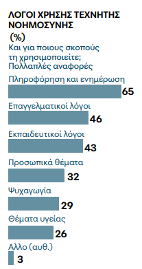 Για ποιον σκοπό όμως χρησιμοποιούν τις εφαρμογές της ΤΝ; Εδώ η εικόνα ποικίλλει. Ξεχωρίζει πάντως σχετικά η χρήση της για πληροφόρηση και ενημέρωση, που αναφέρεται από το 65% εξ όσων δηλώνουν ότι χρησιμοποιούν την ΤΝ στην καθημερινότητά τους.