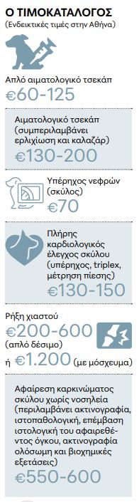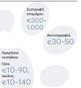 Η αφαίρεση μορφώματος στο στόμα του σκυλιού της κόστισε στην κυρία Θεοδωράκη 150 ευρώ συν 100 ευρώ τη βιοψία – και κανείς δεν ξέρει τι θα ακολουθήσει αν η βιοψία είναι θετική. Η ίδια περιγράφει πώς μια φίλη της πρέπει να χειρουργήσει στο πόδι το νεαρό σκυλί της. Της ζήτησαν 2.000 ευρώ μόνο για το χειρουργείο (όχι για την περίθαλψη που θα ακολουθήσει). Οι τιμές των νοσηλίων επίσης έχουν τεράστιο εύρος. Ενδεικτικά για μια γάτα είναι 50 ευρώ ημερησίως.
