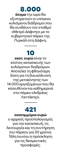 Πρόκειται για μια εικόνα από το κοντινό μέλλον της πόλης. Οταν περισσότεροι από 14.000 εργαζόμενοι θα κατευθύνονται καθημερινά στο πάρκο «Ανδρέας Λεντάκης» που, βάσει του σχεδιασμού, εκτιμάται ότι θα λειτουργήσει πολύ πριν φτάσει εκεί η σχεδιαζόμενη πέμπτη γραμμή του μετρό που θα το εξυπηρετεί, η οποία, στην καλύτερη περίπτωση, δεν θα είναι έτοιμη πριν από το 2037.