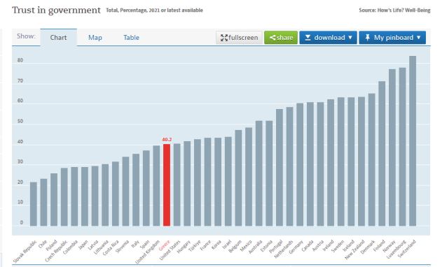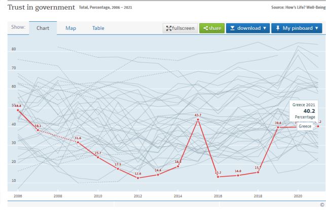 Η απάντηση μπορεί να προέλθει πάλι από έναν βασικό διεθνή δείκτη του ίδιου του ΟΟΣΑ, τον δείκτη της εμπιστοσύνης των πολιτών στην κυβέρνηση. Σύμφωνα λοιπόν με τον Οργανισμό, η Ελλάδα σκοράρει προς τη μέση του μ.ό. του ΟΟΣΑ, μπροστά από χώρες όπως Ισπανία, Ιταλία, Ηνωμένο Βασίλειο και μόλις λίγο πίσω από τις ΗΠΑ.