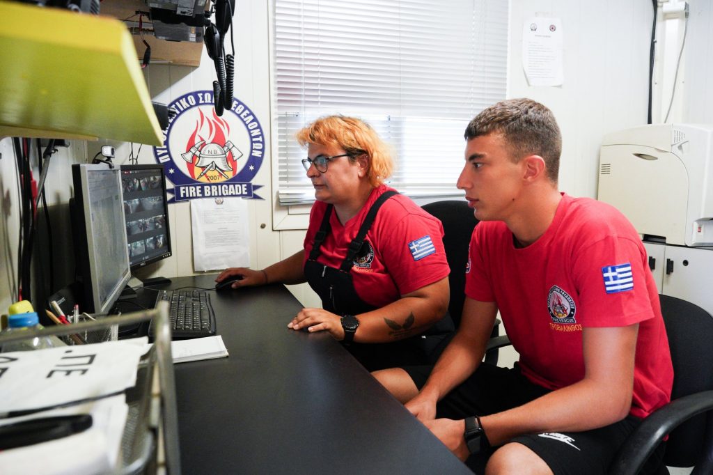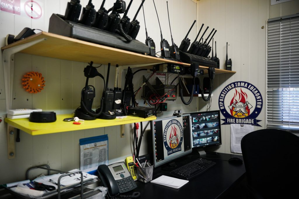 Προτού ακόμη ξεκινήσουμε την ξενάγηση και την κουβέντα, έρχεται στη βάση ο Γιόζεφ, 48 χρόνια εθελοντής πυροσβέστης στη Γερμανία. Ο Γιόζεφ, ο Ράιναρ, η Εβελιν και ο Ρότζερ είναι εθελοντές πυροσβέστες από τη Γερμανία και την Ελβετία. Eρχονται κάθε χρόνο με δικά τους έξοδα, βοηθούν με εξοπλισμό και συμμετέχουν στις δράσεις τους. Στη μνήμη ενός εθελοντή από τη Γερμανία που δεν είναι πια στη ζωή έχουν φτιάξει μια «πλατεία»: Platia Georg-Berrish, δίπλα στο Κέντρο Επιχειρησιακού Χειρισμού (ΚΕΠΙΧ). Από εδώ, με ασύρματους και οθόνες, γίνεται ο συντονισμός της ομάδας. Δίπλα, το ιατρείο και το γυμναστήριο.