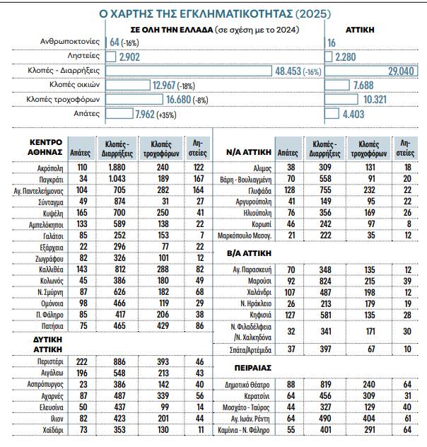 Ο χάρτης της εγκληματικότητας αλλάζει σε ένταση και μορφές δράσης. Το 2025, αν και καταγράφηκε υποχώρηση σε κλοπές και διαρρήξεις, σημειώθηκε παράλληλα εκρηκτική αύξηση 35%, στις απάτες από ψευτοτεχνικούς της ΔΕΗ και δήθεν «λογιστές», με τη συνολική εγκληματική δραστηριότητα να αποφέρει τζίρο 23,4 εκατ. ευρώ.