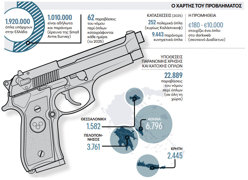 Στην Ελλάδα του 2025 οι Αρχές καταγράφουν κάθε μέρα 62 παραβάσεις του νόμου περί όπλων. Την τελευταία χρονιά, δε, κατεγράφησαν 22.889 παραβάσεις του νόμου περί όπλων, από τις οποίες μόνο οι 82 χαρακτηρίστηκαν κακουργήματα και οι 22.807 πλημμελήματα.