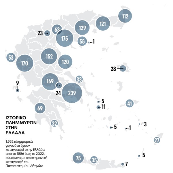Σήμερα, μια νέα ψηφιακή πλατφόρμα του Πανεπιστημίου Αθηνών (ΕΚΠΑ) έρχεται να αποτυπώσει για πρώτη φορά, με επιστημονική ακρίβεια, 140 χρόνια πλημμυρικής ιστορίας της Ελλάδας και να δείξει ότι το νερό, σε αντίθεση με εμάς, δεν ξεχνά. Από τα τέλη του 19ου αιώνα έως σήμερα, οπότε συλλέχθηκαν τα στοιχεία από τους μελετητές, το νερό έχει επανειλημμένως καλύψει πεδιάδες, έχει υπερχειλίσει ποτάμια, έχει διασχίσει πόλεις και χωριά.