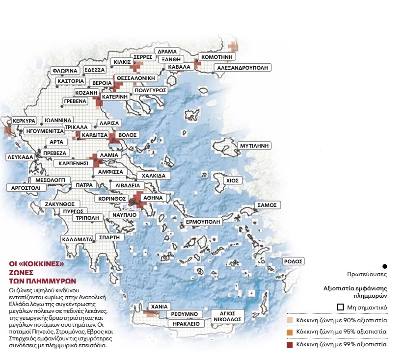 Η Ελλάδα βρίσκεται στη δίνη του κυκλώνα. «Η χώρα μας είναι συνολικά ένα hot spot για πλημμύρες. Διαθέτουμε όλα εκείνα τα χαρακτηριστικά που οδηγούν σε πλημμυρικό κίνδυνο, δηλαδή το έντονο ανάγλυφο, το μοτίβο των βροχοπτώσεων, τις παρατεταμένες ξηρασίες, την έλλειψη βλάστησης, τις πυρκαγιές και τα κακώς κείμενα που έχουμε ως κοινωνία, δηλαδή την άναρχη δόμηση και διάφορες άλλες παρεμβάσεις» υπογραμμίζει η ίδια. Ως προς την εποχική κατανομή των πλημμυρών, τα στοιχεία που έχει επεξεργαστεί η ομάδα του ΕΚΠΑ δείχνουν ξεκάθαρα ότι το φθινόπωρο είναι η πιο επικίνδυνη περίοδος.