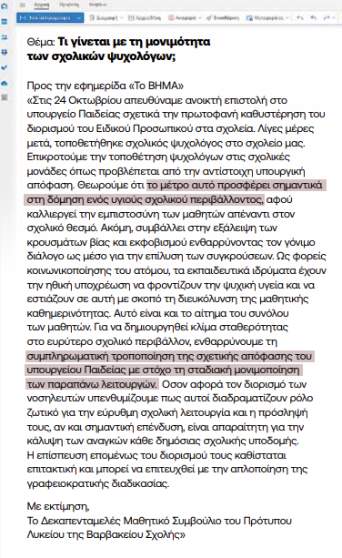 «Κάτι να καταθέσει ένα παιδί, να θίξουμε ένα ζήτημα, να το συζητήσουμε, έχει και αυτό κάποιο αποτέλεσμα – έστω και μία φορά την εβδομάδα» μας είπε σχολική ψυχολόγος, η οποία, όταν της μεταφέραμε την πρόταση των παιδιών της Βαρβακείου, να υπάρχει δηλαδή μόνιμα, καθημερινά, ψυχολόγος στο σχολείο, σχολίασε: «Για να είναι πιο σωστό το αποτέλεσμα έτσι πρέπει να είναι, έχουν δίκιο».