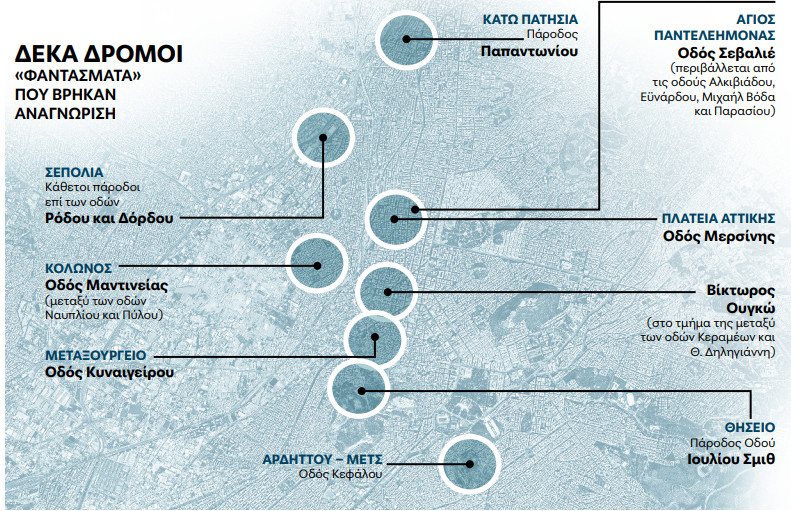 Κι όμως, αυτός ο υπεραιωνόβιος δρόμος έως τα τέλη του περασμένου Ιουλίου ήταν αόρατος στα σχέδια πόλης. Για δεκαετίες τα κτίρια είχαν μοναδικό «πρόσωπο» σε έναν δρόμο που δεν ήταν αναγνωρισμένος, με ό,τι αυτό συνεπάγεται για τη νομιμότητά τους.