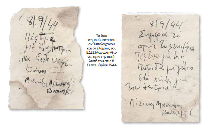Αφήνει δύο σημειώματα με παρόμοιο περιεχόμενο: «8.9.44. Σήμερα το πρωί τουφεκιζόμεθα. Πέφτουμε για την Πατρίδα με γέλιο στα χείλη, για τη λεφτεριά. Λίτινας Μανώλης. Βατατζή 6» και «Πέφτομε για την λεφτεριά. Να είσθε υπερήφανοι». Ο δε Κωνσταντίνος Μπούρας, σύνδεσμος του αντισυνταγματάρχη Δημήτρη Ψαρρού της ΕΚΚΑ που πιάστηκε τον Μάρτιο του 1943 από την Γκεστάπο, βασανίστηκε και εκτελέστηκε τον Ιούνιο του 1943, γράφει: «Χρυσή μου μανούλα, Παρηγορήσου με τ’ άλλα σου παιδιά όπως μπορείς. Σας φιλώ τρυφερά Ηλία, Χρήστο, Νικήτα, Ελένη. Σας φιλώ όλους. Ζήτω η Ελλάδα».