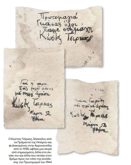 Ο δε Κώστας Τσίρκας, δάσκαλος από τα Πράμαντα της Ηπείρου και αυτός φυλακισμένος στην Ακροναυπλία από το 1938, αφήνει μια σειρά από σημειώματα, άλλα στο σακάκι του και άλλα που πετάει στον δρόμο προς τον τόπο της εκτέλεσης: «1.5.44. Γεια και χαρά. Σας φιλώ όλους με πολλή αγάπη… Κατίνα, Γιωργούλη, Σας φιλώ με αγάπη. Κώστας Τσίρκας. Μάρνη 52, Αθήνα… Πρωτομαγιά. Γεια σας όλοι, πάμε στη μάχη».