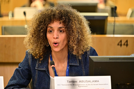 H Παλαιστίνια συγγραφέας, ερευνήτρια και ακτιβίστρια, Ταμάμ Αμπουσαλάμα, παρουσιάζει την πρωτοβουλία πλήρους αναστολής της συμφωνίας σύνδεσης ΕΕ-Ισραήλ λόγω των παραβιάσεων των ανθρωπίνων δικαιωμάτων από το Ισραήλ στη Γάζα. Πηγή: EESC.