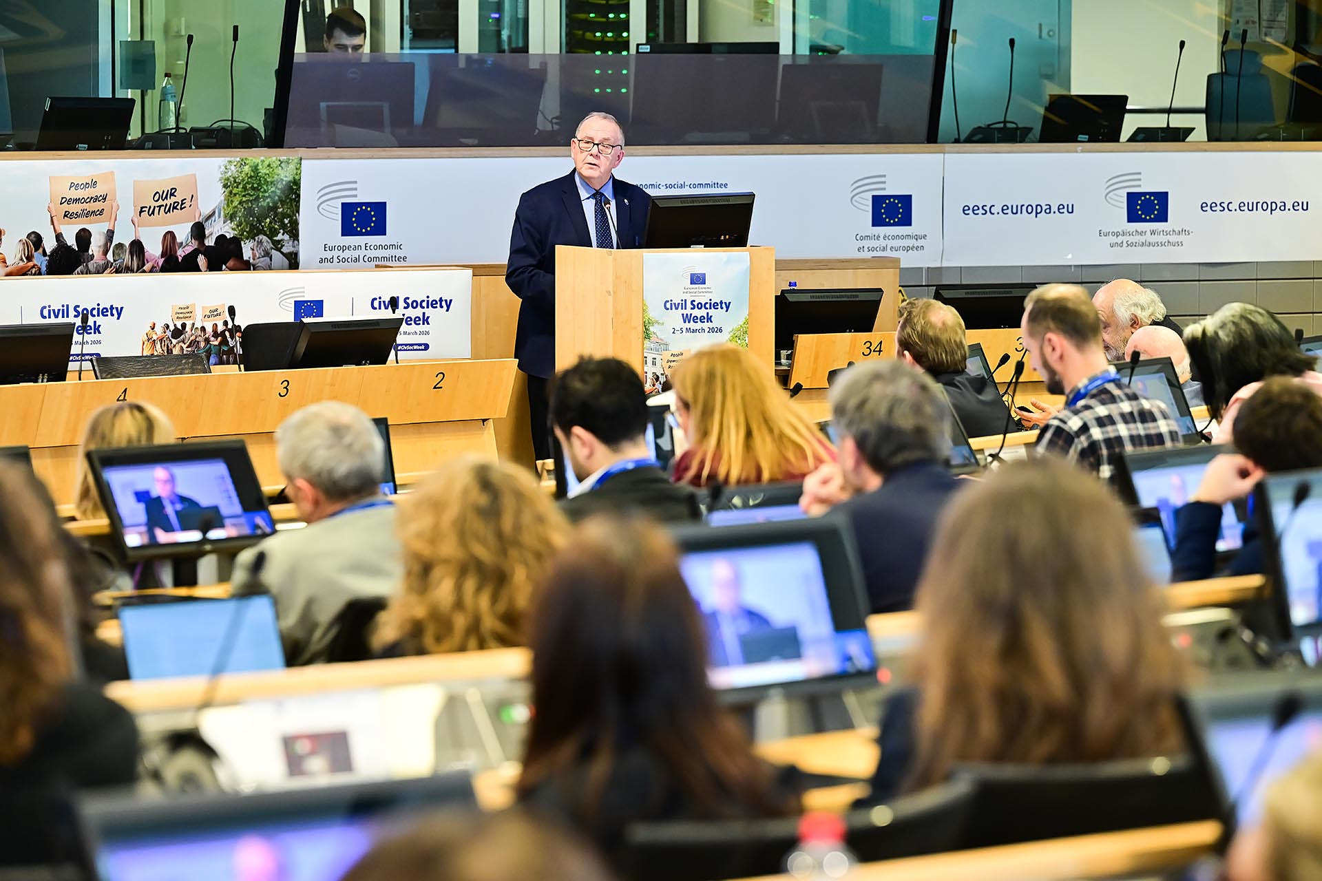 Με κεντρικό σύνθημα «Πολίτες, Δημοκρατία, Ανθεκτικότητα», η φετινή εβδομάδα της Κοινωνίας των Πολιτών στις Βρυξέλλες κινήθηκε σε δύο βασικούς άξονες: αφενός στις προτεραιότητες της νέας θητείας της Ευρωπαϊκής Επιτροπής για μια ένωση ευκαιριών, ασφάλειας και ανθεκτικότητας, αφετέρου σε τρεις κομβικές προτεραιότητες που αφορούν την καταπολέμηση της φτώχειας και του κοινωνικού αποκλεισμού με την ενίσχυση της συμμετοχής των πολιτών, την αποκατάσταση της εμπιστοσύνης στους ευρωπαϊκούς θεσμούς και, τέλος, τη γεφύρωση περιφερειακών ανισοτήτων αλλά και διαγενεακών ρηγμάτων. Ταυτόχρονα, έκδηλη ήταν η ανησυχία όλων, συμπεριλαμβανομένων των υψηλόβαθμων αξιωματούχων της ΕΟΚΕ για τον πόλεμο στη Μέση Ανατολή, ζητώντας ρητώς τον τερματισμό του ακολουθώντας τον δρόμο της διπλωματίας και του διεθνούς δικαίου.