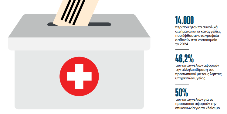 Από την πλευρά της η γενική γραμματέας Υπηρεσιών Υγείας Λίλιαν Βιλδιρίδη αναφέρει στο «Βήμα» ότι «το 2024, μέσα σε έναν μόλις χρόνο, οι γραπτές καταγγελίες αυξήθηκαν κατά 25,5%. Ακόμη μεγαλύτερη ήταν η αύξηση στα αιτήματα, κατά 36,4%, καθώς και στις θετικές εντυπώσεις, οι οποίες σημείωσαν άνοδο κατά 30,8%». Σύμφωνα με τα στοιχεία του έτους 2024, το υψηλότερο ποσοστό καταγγελιών (46,2%) αφορά την αλληλεπίδραση του προσωπικού με τους λήπτες υπηρεσιών υγείας, με τα πιο συχνά προβλήματα σε αυτή την κατηγορία να αφορούν την επικοινωνία για το κλείσιμο ραντεβού (20,7%). Στη δεύτερη θέση (40,4%) βρίσκονται οι καταγγελίες και τα παράπονα που σχετίζονται με τις διοικητικές διαδικασίες ή με διαδικαστικές δυσλειτουργίες, με τον πιο συχνό λόγο διαμαρτυρίας να είναι οι καθυστερήσεις στην ολοκλήρωση των διοικητικών διαδικασιών (9,5%). Τρίτη έρχεται η κατηγορία του κλινικού έργου (13,4%), με τα παράπονα ή τις καταγγελίες να αφορούν κυρίως καθυστερήσεις στην πραγματοποίηση ή στον προγραμματισμό εξετάσεων (2,4%).