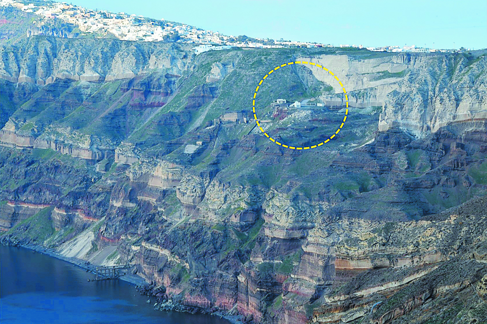 Τρίτον, υπάρχουν κτίρια πάνω από υπόσκαφα που επιδεινώνουν τη συμπεριφορά της κατασκευής. «Δεν μπορεί στα δύο-τρία μέτρα πάνω από την οροφή του υποσκάφου να υπάρχει κατασκευή. Το κτίριο από πάνω πρέπει να θεμελιώνεται τουλάχιστον 10 μέτρα πιο ψηλά. Τα υπόσκαφα πρέπει να έχουν μελετηθεί σωστά, με ενισχυμένη οροφή, ώστε να μπορούν να σηκώσουν και τα υπερκείμενα κτίρια» σημειώνει ο καθηγητής. Τέταρτον, το έδαφος είναι κίσηρη (η γνωστή ελαφρόπετρα), ένα ηφαιστειογενές πορώδες πέτρωμα που δεν έχει μεγάλες αντοχές και σε συνδυασμό με τις απότομες κλίσεις πολλαπλασιάζει τον κίνδυνο. Πέμπτον, υπάρχουν αρκετά κτίσματα που βρίσκονται κάτω από τη στέψη του κρατήρα, κοντά στη θάλασσα, τα οποία κινδυνεύουν από κατολισθήσεις.