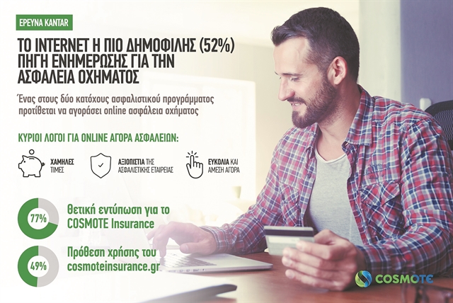 Ενας στους δύο καταναλωτές στην Ελλάδα που είναι κάτοχοι ασφαλιστικού προγράμματος προτίθενται να αγοράσουν online ασφάλεια οχήματος, σύμφωνα με έρευνα που πραγματοποίησε η εταιρεία Kantar για λογαριασμό της COSMOTE. Η έρευνα αναδεικνύει, επίσης, το Internet ως την πιο διαδεδομένη (52%) πηγή ενημέρωσης για την ασφάλεια οχήματος.