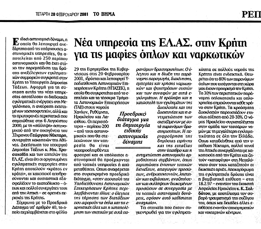 Τη δεκαετία του ’90, και μετά από τρεις φονικές βεντέτες, είχε επιχειρηθεί και πάλι η ενίσχυση των αστυνομικών δυνάμεων στην Κρήτη. Τον Φεβρουάριο του 2001 ο κ. Χρυσοχοΐδης, στην πρώτη θητεία του στη λεωφόρο Κατεχάκη, είχε ανακοινώσει (με αφορμή μια… απαγωγή αξιωματικού της ΕΛ.ΑΣ. από τη «μαφία του Μυλοποτάμου») μια σειρά μέτρων παρόμοιων με εκείνα που εξαγγέλθηκαν το πρωί της Παρασκευής. Δηλαδή τη δημιουργία «ειδικής αστυνομικής δύναμης – Υποδιεύθυνση Αστυνομικών Επιχειρήσεων Κρήτης (ΥΠΑΣΕΚ) – που θα λειτουργεί ανεξάρτητα από τις υπάρχουσες αστυνομικές υπηρεσίες και θα αποτελείται από 250 περίπου αστυνομικούς».