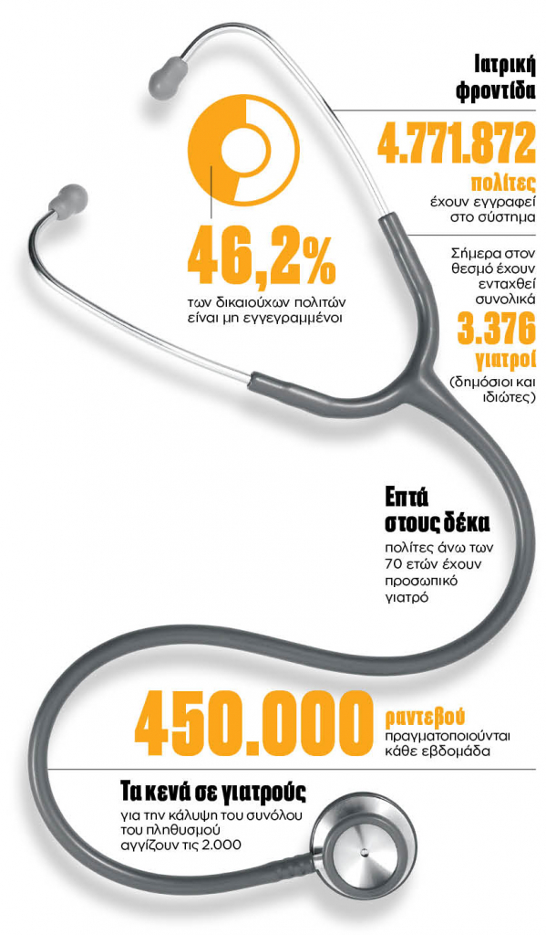 Χωρισμένη στα δύο είναι η Ελλάδα σε ό,τι αφορά την πρόσβαση σε προσωπικό γιατρό. Σύμφωνα με τα επίσημα στοιχεία, ο μισός πληθυσμός της χώρας έχει ήδη εγγραφεί στο σύστημα, εκτελώντας δωρεάν ραντεβού με τον γιατρό της επιλογής του, ενώ ο άλλος μισός απέχει είτε κατ’ επιλογήν (κατά κανόνα νεότεροι πολίτες που δεν εκδηλώνουν ενδιαφέρον) είτε κατ’ ανάγκη (καθώς οι γιατροί δεν επαρκούν).