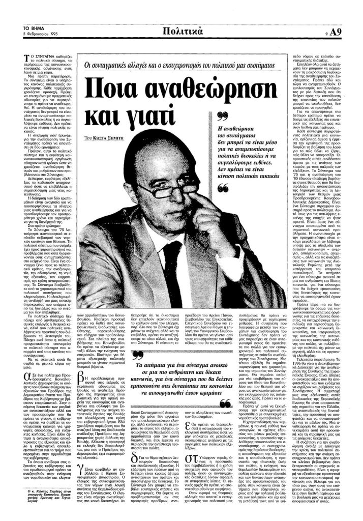 Και όμως. Ο Κώστας Σημίτης, υπουργός Εμπορίου, Βιομηχανίας, Ερευνας και Τεχνολογίας στην κυβέρνηση Ανδρέα Παπανδρέου, λίγα χρόνια πριν, στις 5 Φεβρουαρίου 1995, είχε δημοσιεύσει στο «Βήμα» ένα σημαντικό άρθρο για τη συνταγματική αναθεώρηση με τον χαρακτηριστικό τίτλο «Ποια αναθεώρηση και γιατί. Οι συνταγματικές αλλαγές και ο εκσυγχρονισμός του πολιτικού μας συστήματος». Εύλογα μπορεί να υποθέσει κανείς ότι ο χρόνος δημοσίευσης του άρθρου δεν ήταν τυχαίος: Ο Ανδρέας Παπανδρέου στο πρωτοχρονιάτικο μήνυμά του το 1995 είχε εξαγγείλει την έναρξη της διαδικασίας της συνταγματικής αναθεώρησης, η οποία ολοκληρώθηκε έξι χρόνια μετά λόγω της διάλυσης της Βουλής το 1996. Και ο Κώστας Σημίτης, που διεκδικούσε ηγετικό ρόλο, προφανώς δεν ήθελε να μείνει απών από τις εξελίξεις σε ένα τόσο σημαντικό θεσμικό και πολιτικό ζήτημα.