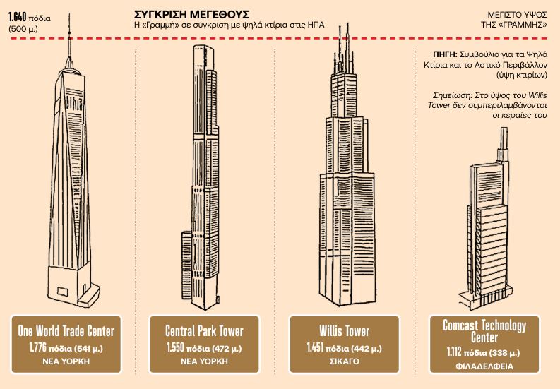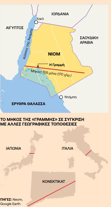 Το πιο υπερφίαλο από αυτά τα έργα είναι η ναυαρχίδα του όλου κόνσεπτ, η οποία ονομάζεται «Γραμμή». Πρόκειται για ένα ζεύγος ουρανοξυστών τρισεκατομμυρίων δολαρίων, ψηλότερων από το Empire State Building, που έχουν σχεδιαστεί να εκτείνονται σε μήκος 170 χλμ. και να στεγάσουν 9 εκατομμύρια ανθρώπους. Ο βασικός υποστηρικτής του έργου, ο σαουδάραβας πρίγκιπας και ντε φάκτο ηγεμόνας της χώρας, Μοχάμεντ μπιν Σαλμάν, παρομοίασε το πρότζεκτ με τις μεγάλες πυραμίδες της Αιγύπτου. Τους τελευταίους μήνες το βασίλειο αναθεώρησε προς τα κάτω τις δαπάνες για την πρώτη φάση της «Γραμμής», αντιμετωπίζοντας την πραγματικότητα του κόστους σε μια περίοδο που η χώρα ξοδεύει πολύ περισσότερα από όσα εισπράττει. Τώρα το σχέδιο των ιθυνόντων προβλέπει αρχικά την οικοδόμηση 2,5 χλμ. της κατασκευής έως το 2030, αντί για τα σχεδόν 15 χιλιόμετρα έργου που αποτελούσε προηγουμένως το όραμα για την πρώτη φάση, σύμφωνα με πρόσωπα που γνωρίζουν το σχεδιασμό. Και πάλι ωστόσο, ακόμη και αυτό το περικομμένο τμήμα θα αποτελεί μακράν το μεγαλύτερο κτίριο του κόσμου – ισοδυναμώντας με πάνω από 60 Empire State Buildings σε εμβαδό.