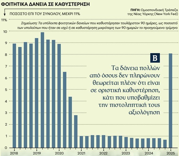 Αυτόν τον μήνα, η Ομοσπονδιακή Τράπεζα της Νέας Υόρκης ανέφερε ότι το ποσοστό καθυστερήσεων στα φοιτητικά δάνεια πραγματοποίησε άλμα από 0,7% στο τέταρτο τρίμηνο του 2024 σε 8% στο πρώτο τρίμηνο του 2025 – επιστρέφοντας περίπου στα προ πανδημίας επίπεδα.