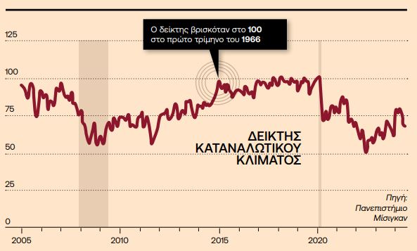 Οι καταναλωτικές έρευνες του Πανεπιστημίου του Μίσιγκαν έδειξαν ότι η καταναλωτική εμπιστοσύνη, αν και πολύ πάνω από το ιστορικό χαμηλό που σημείωσε στα μέσα του 2022, παραμένει συγκρατημένη, καθώς οι υψηλές τιμές επηρεάζουν αρνητικά τη συμπεριφορά των καταναλωτών, ιδίως όσων έχουν χαμηλότερα εισοδήματα, ανέφερε η Joanne Hsu, διευθύντρια των ερευνών, μετά την έκθεση του Ιουλίου.