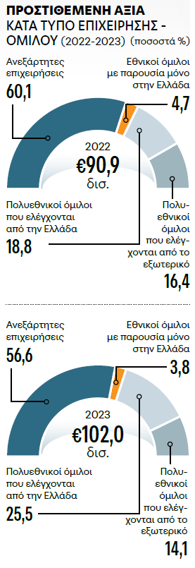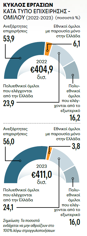 Οι ανεξάρτητες επιχειρήσεις, αν και αποτελούν τη συντριπτική πλειονότητα (928.249 το 2023), συνεισφέρουν το 56,0% του κύκλου εργασιών και το 56,6% της προστιθέμενης αξίας. Παράλληλα, επωμίζονται το τεράστιο βάρος της απασχόλησης, απορροφώντας το 84,5% των εργαζομένων (2.948.914 άτομα). Στον αντίποδα, οι πολυεθνικοί όμιλοι, είτε ελέγχονται από την Ελλάδα είτε από το εξωτερικό, επιδεικνύουν μια υψηλή ικανότητα παραγωγής πλούτου σε σχέση με το εργατικό δυναμικό που απασχολούν. Οι ανεξάρτητες επιχειρήσεις κυριαρχούν σε τομείς έντασης εργασίας και χαμηλότερων κεφαλαιακών απαιτήσεων, όπως οι κατασκευές, το λιανικό εμπόριο, οι υπηρεσίες εστίασης και καταλύματος. Αντιθέτως, σε στρατηγικούς τομείς που απαιτούν βαριές υποδομές, τεχνογνωσία αιχμής και δικτύωση, όπως η μεταποίηση, η παραγωγή ενέργειας και οι χρηματοπιστωτικές υπηρεσίες, το μεγαλύτερο μερίδιο του κύκλου εργασιών ελέγχεται από πολυεθνικούς ομίλους ελληνικών συμφερόντων.