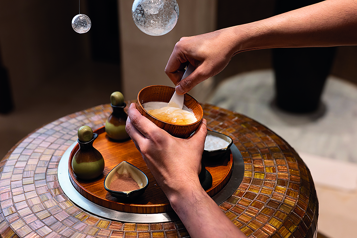 Το ξενοδοχειακό συγκρότημα σχεδιάστηκε με διακριτική κομψότητα από υλικά όπως το μπαμπού, η πέτρα και το ξύλο. Το Gentleman’s Lounge είναι ένας ιδιωτικός χώρος χαλάρωσης επενδυμένος με μαόνι, με βιβλιοθήκη και lounge bar όπου σερβίρονται αφεψήματα βοτάνων και υγιεινά σνακ. Οι Therapy Suites είναι ανεξάρτητες καμπίνες θεραπείας με ιδιωτικά υδρομασάζ, ντους και θέα στους καταρράκτες των κήπων. Το Barber & Grooming Studio και η Vitality Pool Area (υπαίθρια ιαματική πισίνα με ιαπωνική αισθητική) είναι δύο ακόμη «ψηφίδες» σε ένα σκηνικό άνεσης και ηρεμίας.