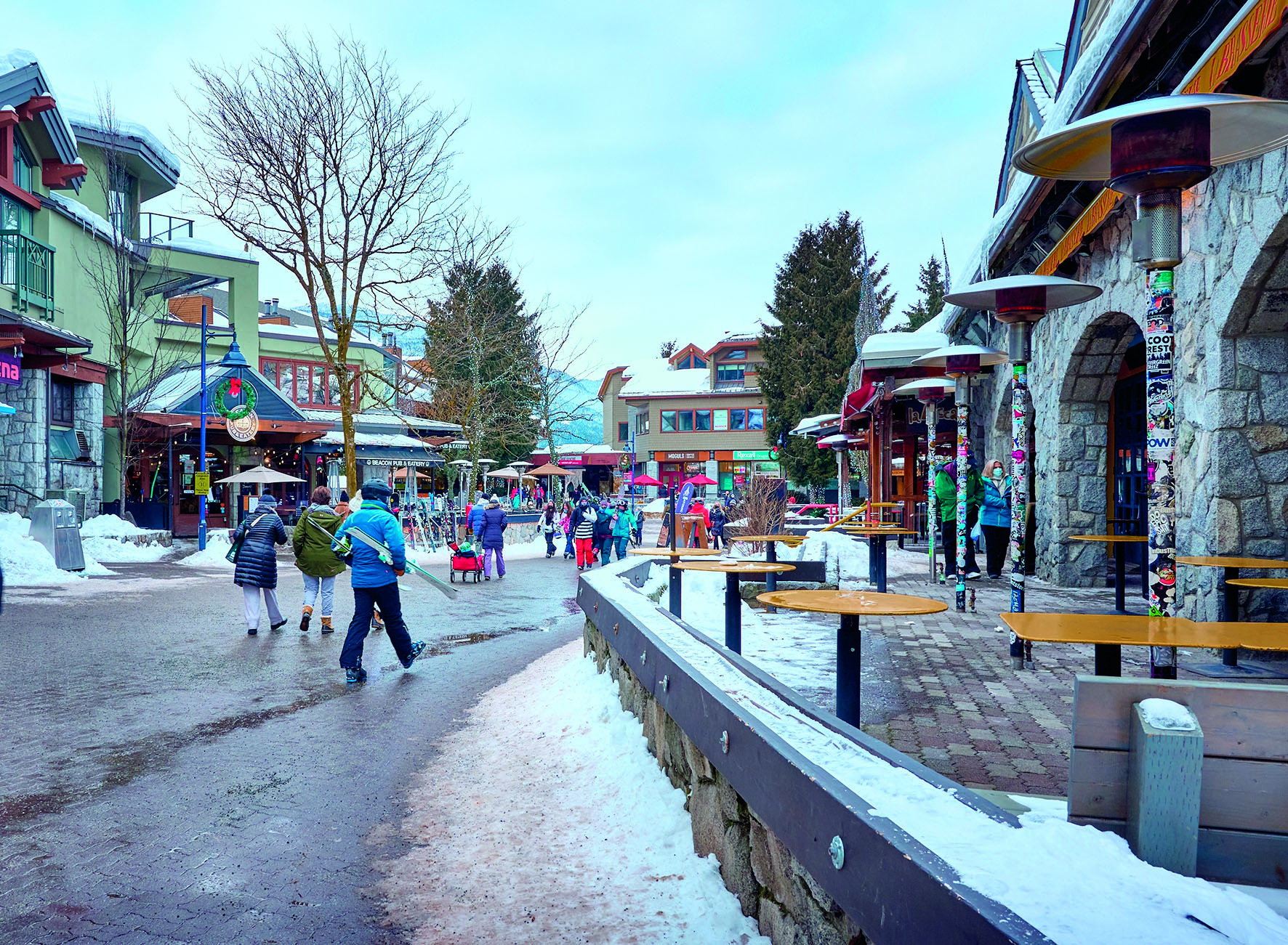 Σκιέρ και άλλοι επισκέπτες βολτάρουν (υπό χαμηλές θερμοκρασίες) στους κεντρικούς δρόμους του οικισμού του Γουίσλερ.