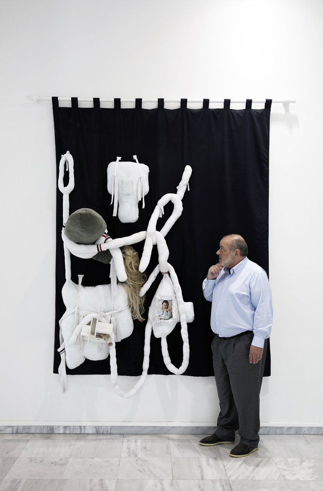 Είναι ένας μικρός πίνακας που μοιάζει απροσπέλαστος γιατί φαίνεται ότι γράφει κάτι που δεν μπορείς να διαβάσεις. Ανάλογα από το πόσο κοντά θα πλησιάσεις, με τις σωστές συντεταγμένες θέασης, το βλέπεις ξεκάθαρα: από το έργο του Τομ Φρίντμαν στο γραφείο του Δημήτρη Δασκαλόπουλου στο Μαρούσι αναδύεται, σχεδόν μέσα από μιαν αχλύ, η λέξη «Ego». Διακριτικά εμφανής, αν και αναμφισβήτητα παρούσα, δεν επιβάλλεται και μάλλον σε περιμένει να την ανακαλύψεις. Δεν είναι ένα έργο που έχει δημιουργηθεί για τον ίδιο, άλλωστε ο Δημήτρης Δασκαλόπουλος δεν είναι ένας συλλέκτης που θέλγεται ή επιδιώκει να τον βιογραφούν με κάποιον τρόπο οι καλλιτέχνες το έργο των οποίων συλλέγει, όμως σκέπτομαι ότι ταιριάζει με έναν τρόπο με τον ιδιοκτήτη του. Εναν πολύ επιτυχημένο επιχειρηματία, έναν από τους μεγαλύτερους συλλέκτες σύγχρονης τέχνης διεθνώς, με την αντίστοιχη προβολή που επιφέρουν τέτοια μεγέθη δράσης, τον οποίο όμως συναντώ σε έναν πολύ απλό, ας πούμε «σπαρτιατικής» corporate λιτότητας χώρο. Λίγοι κατάλογοι εκθέσεων και βιβλία φέρνουν στον χώρο τις εκθέσεις της συλλογής του εξωτερικού και την κοινωφελή δραστηριότητα του οργανισμού πολιτισμού και ανάπτυξης ΝΕΟΝ αλλά και του ανεξάρτητου, μη κερδοσκοπικού ερευνητικού οργανισμού διαΝΕΟσις, σημαίνοντα που απηχούν πολύτιμα, όσο και σπάνια για έναν επιχειρηματία/συλλέκτη σημαινόμενα. Αλλωστε συναντηθήκαμε στον απόηχο της δωρεάς ενός μεγάλου μέρους της συλλογής του (περισσότερα από 350 έργα) σε ΕΜΣΤ, Tate Modern, Guggenheim και MCA Chicago και της έκθεσης «Dream On» στο πρώην Δημόσιο Καπνεργοστάσιο. Εκεί όπου σε επιμέλεια του Δημήτρη Παλαιοκρασσά, ιστορικού Τέχνης και συμβούλου της συλλογής του, παρουσιάζονται έργα προτού ταξιδέψουν για τους νέους τους προορισμούς. Στην πλειονότητά τους, μεγάλων, τεραστίων διαστάσεων.