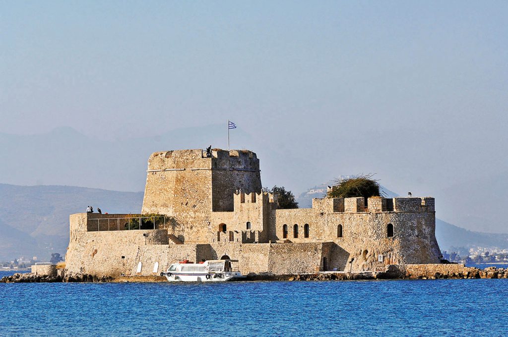Το ιστορικό Μπούρτζι αναδύεται από τη θάλασσα και αγναντεύει το λιμάνι του Ναυπλίου.