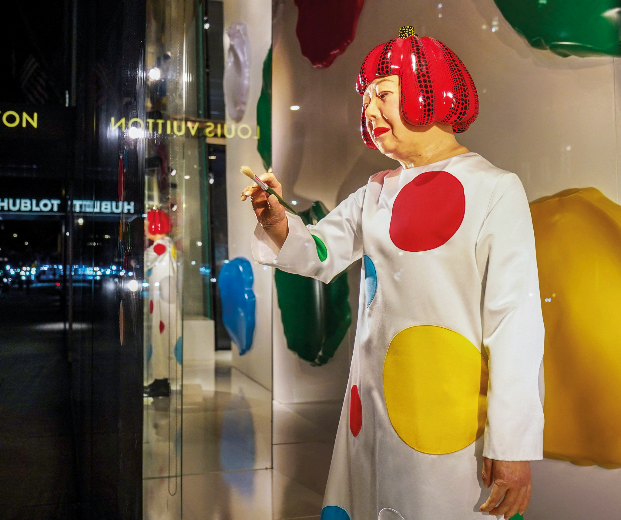 Το ρομπότ με τη μορφή της Γιαγιόι Κουσάμα (δύσκολο να καταλάβεις πως δεν πρόκειται για άνθρωπο!) ζωγραφίζει τις βιτρίνες του καταστήματος του οίκου Louis Vuitton στο Μανχάταν.