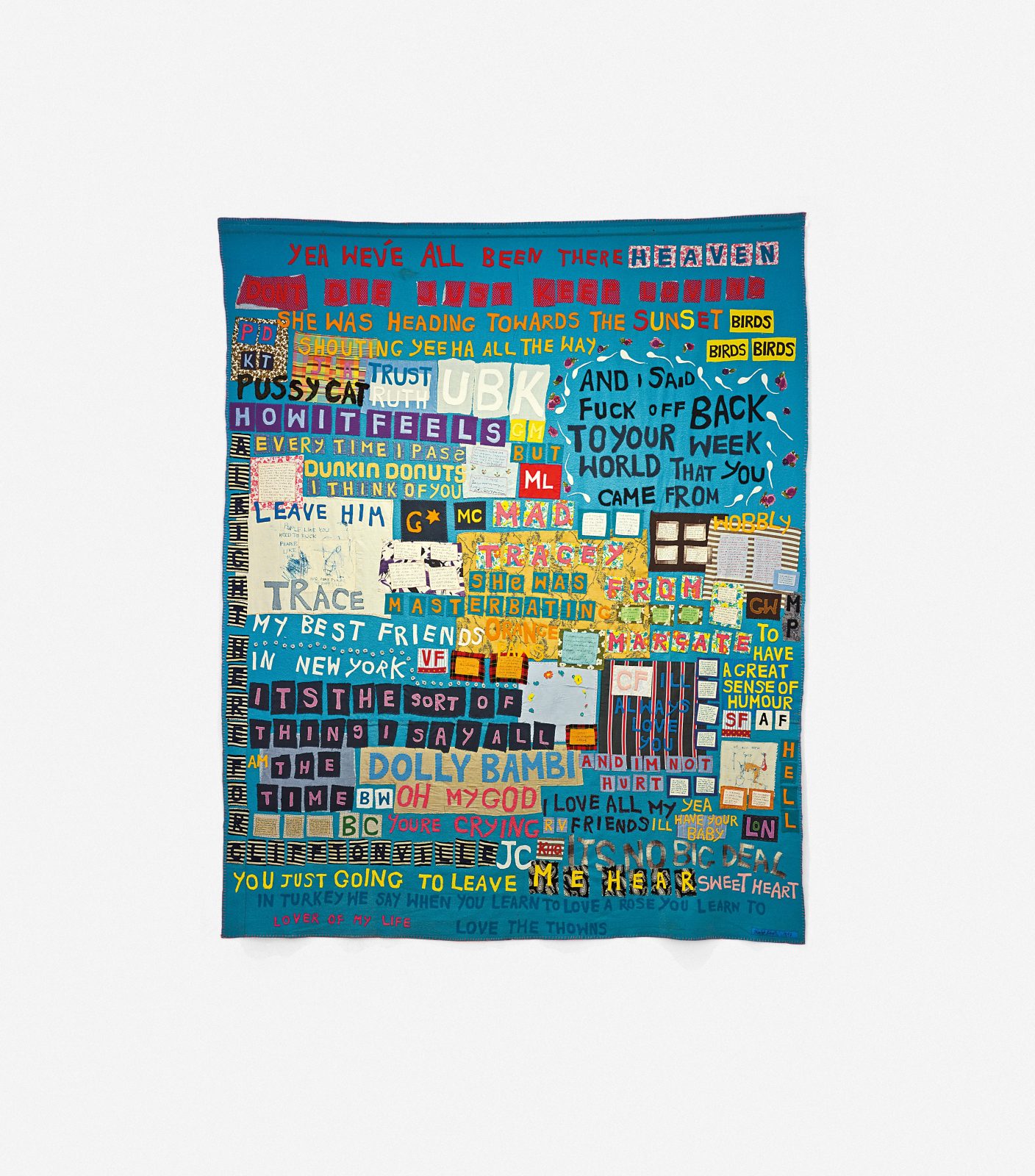Η σχέση της Εμιν με την πόλη όπου μεγάλωσε (γεννήθηκε στο Κρόιντον) αποτελεί έναν άλλο κεντρικό άξονα της έκθεσης. Εργα όπως το «Mad Tracey From Margate: Everyone’s Been There» (1997), μια μεγάλη κουβέρτα φτιαγμένη με κομμάτια ρούχων φίλων της, γεμάτη χειρόγραφες φράσεις και προσωπικές εκμυστηρεύσεις, λειτουργούν σαν οπτική αυτοβιογραφία, καταγράφοντας αναμνήσεις, συναισθήματα και μικρές ιστορίες.