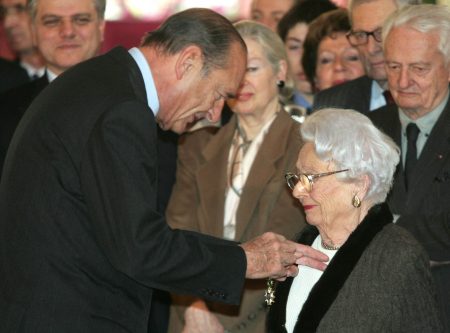 Ο τότε πρόεδρος της Γαλλίας Ζακ Σιράκ, με το Μετάλλιο της Λεγεώνας της Τιμής τον Φεβρουάριο του 2005. (Photo by PATRICK KOVARIK / AFP)