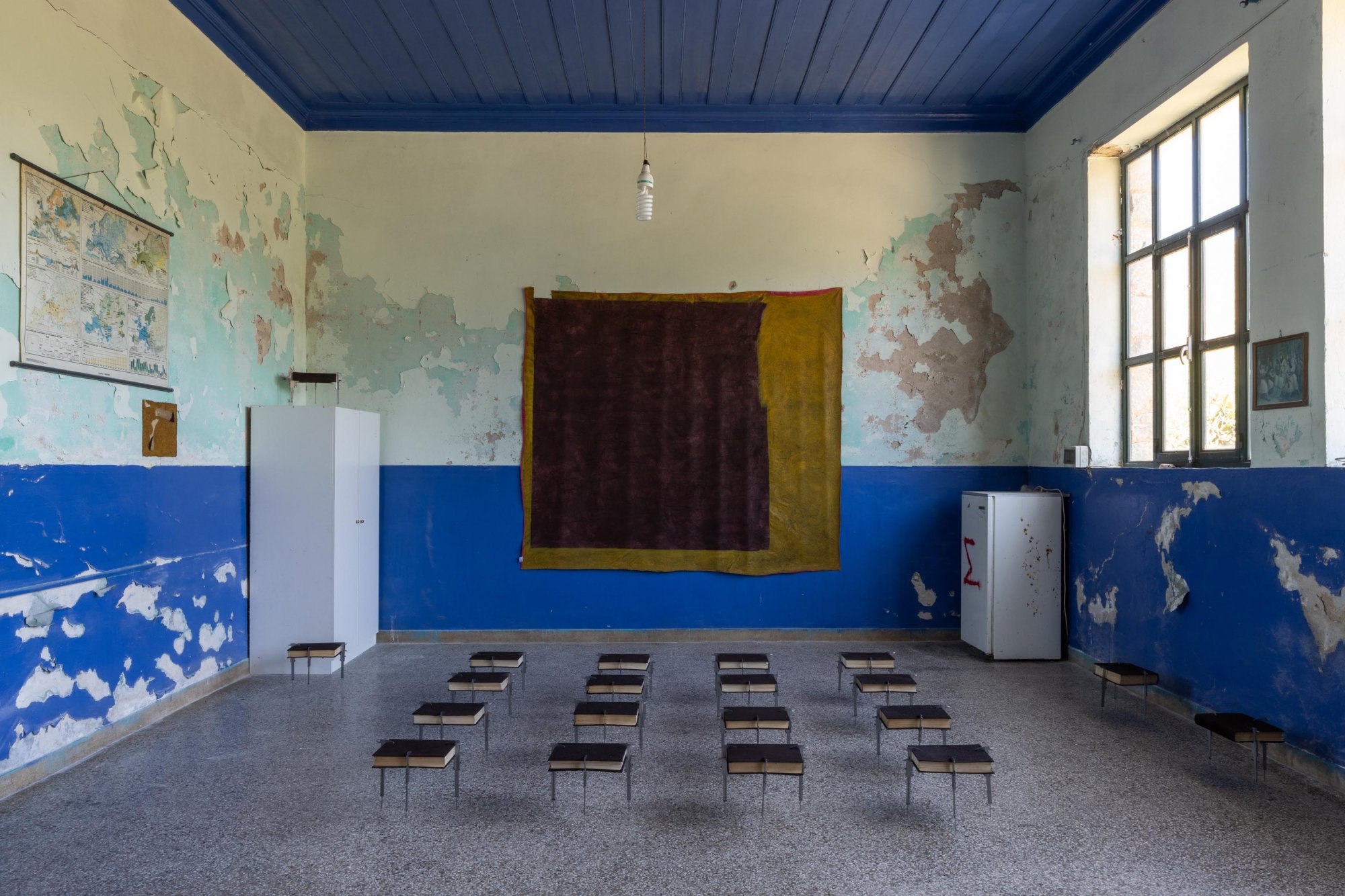 Στο δημοτικό σχολείο του οικισμού η εγκατάσταση του Φράνσις Όφμαν «72 παχύμετρα με εγκυκλοπαίδειες», με φόντο ένα άτιτλο έργο του με πρώτες ύλες του ακρυλικό χρώμα, μελάνι, κατακάθια καφέ και κιμωλία της Μπολόνια @Νίκος Αλεξόπουλος