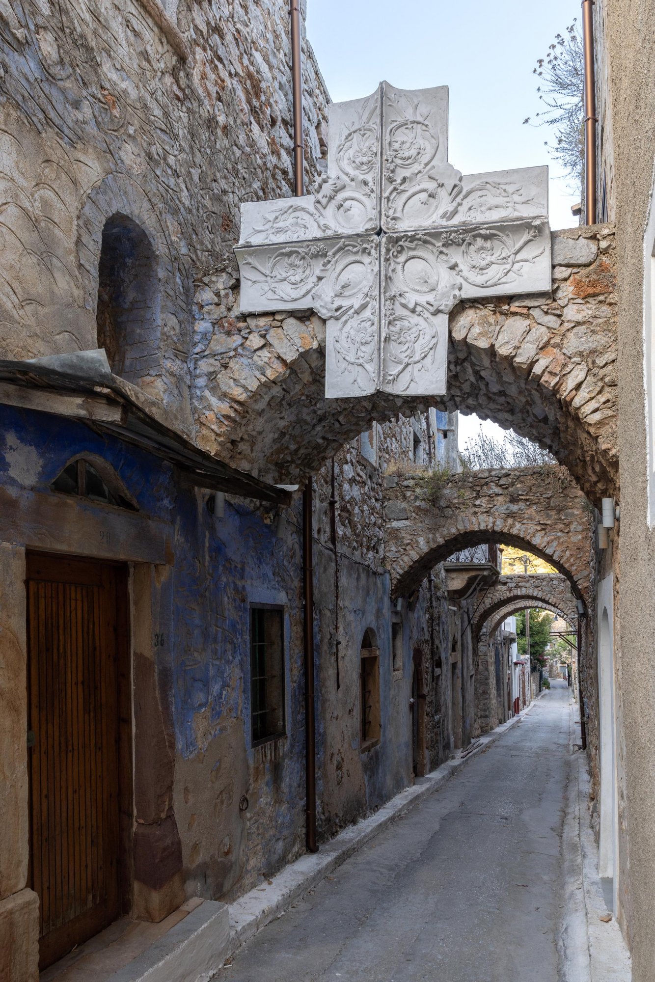 Πρόκειται για συνθέσεις φυτών και γεωμετρικών στοιχείων που μοιάζουν αποσπασμένα από υπάρχοντα αρχιτεκτονικά στοιχεία – για παράδειγμα, ανθέμια, φουρούσια – και βρίσκονται σε εγκαταλελειμμένα ή συντηρημένα τμήματα των τειχών. Είναι εμπνευσμένα από το παρελθόν του οικισμού, όπως ο μεγάλος, εντυπωσιακός σταυρός (2Χ2 μ.) με τις τέσσερις γωνίες του να παραπέμπουν στους τέσσερις πύργους του περίκλειστου χωριού, ειδικά υλοτομημένου για να προστατεύεται από τις πειρατικές επιδρομές. Εχει αναρτηθεί σε μια αψίδα με ανάγλυφα διακοσμητικά στοιχεία που μαρτυρούν την κατάκτηση της Χίου και την επιρροή από τους Γενουάτες (1346-1566).