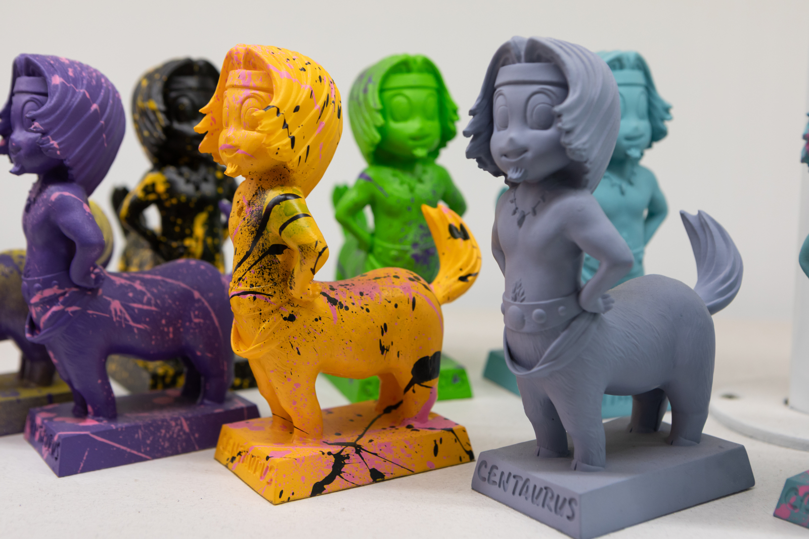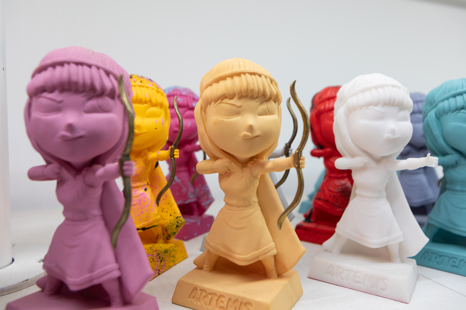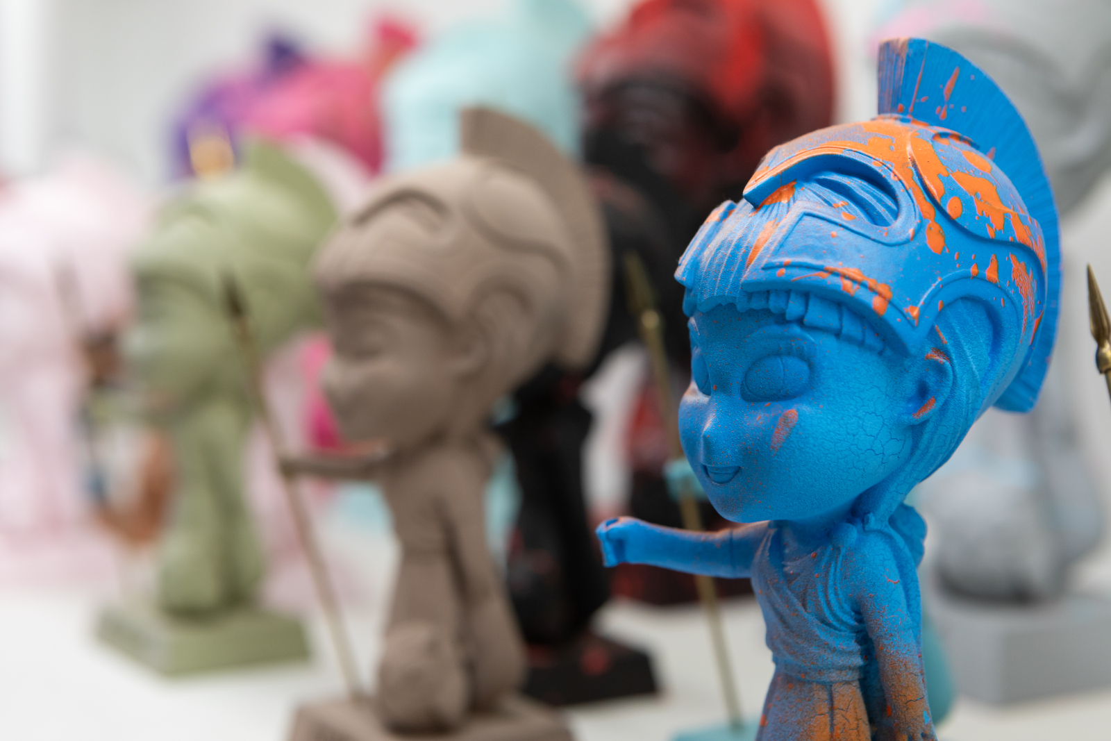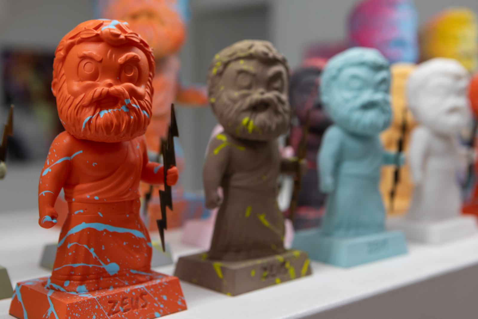 Η Αθηνά, ο Δίας, ο Ποσειδώνας, ο Απόλλωνας, η Αρτεμις και ο Ερμής, αλλά και ο Λεωνίδας, η Μέδουσα, ο Ηρακλής, ο Κένταυρος, όλοι οι σταρ της αρχαίας ελληνικής μυθολογίας περασμένοι από ένα αναπολογητικά χρωματιστό ποπ φίλτρο και «λουστραρισμένοι» με την αισθητική του γκράφιτι. Ολοι τους όχι μεγαλύτεροι σε ύψος από 15 εκατοστά, αλλά ερωτεύσιμοι με την πρώτη ματιά – ποιος είπε ότι το μέγεθος μετράει;