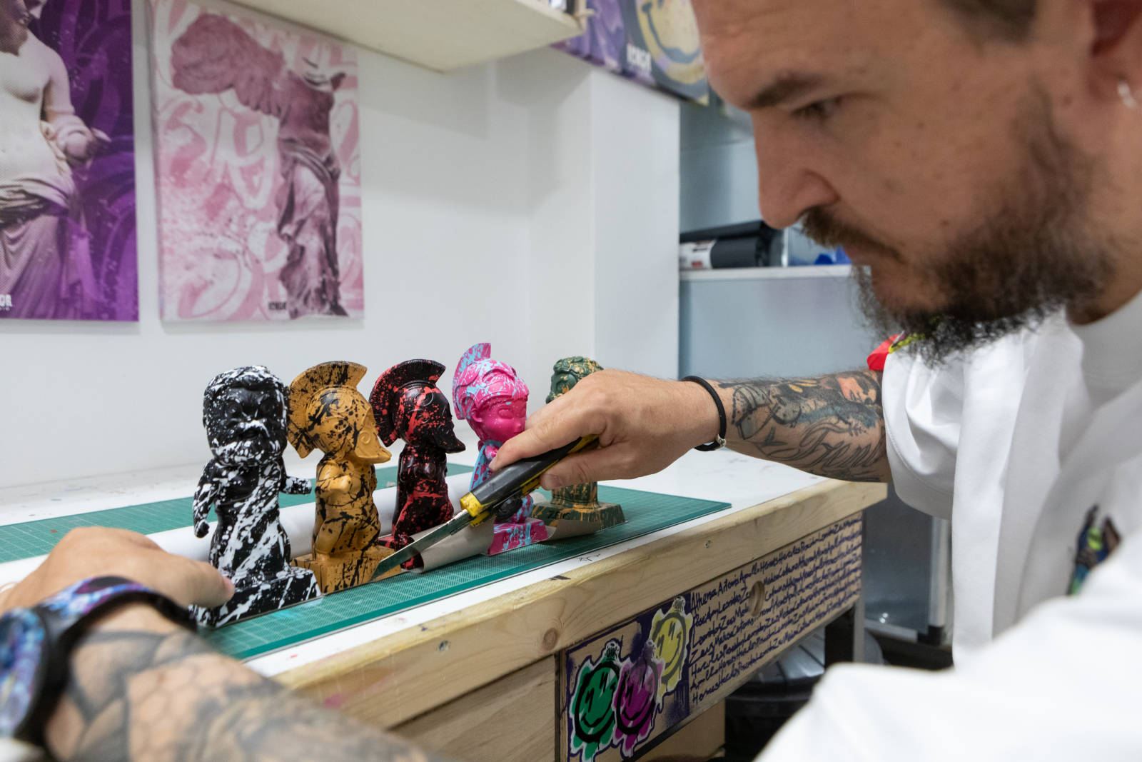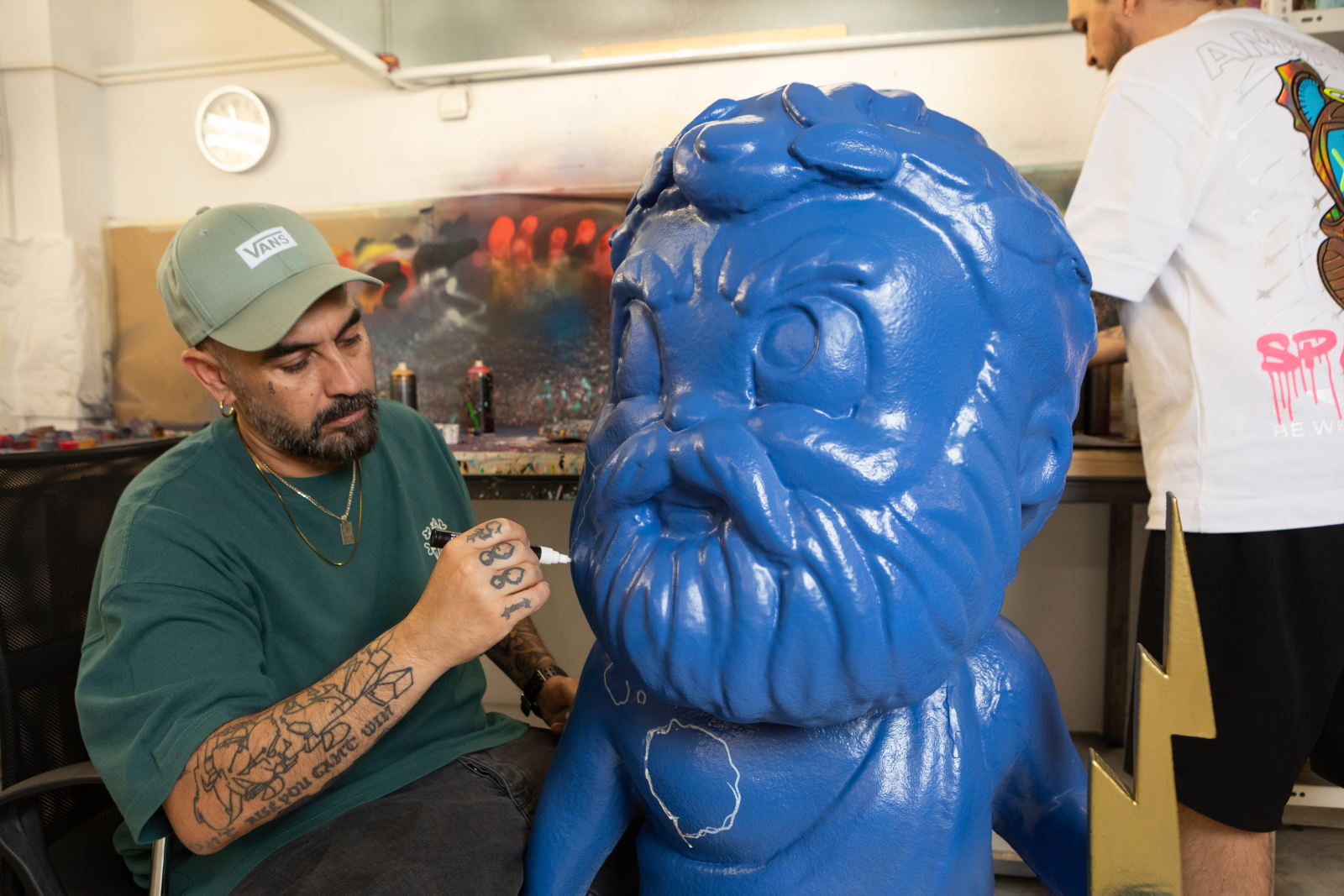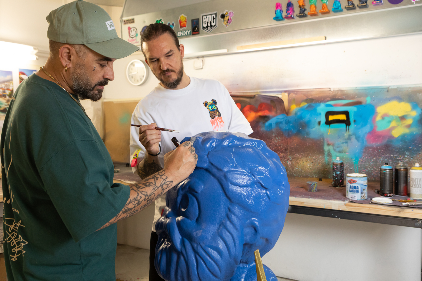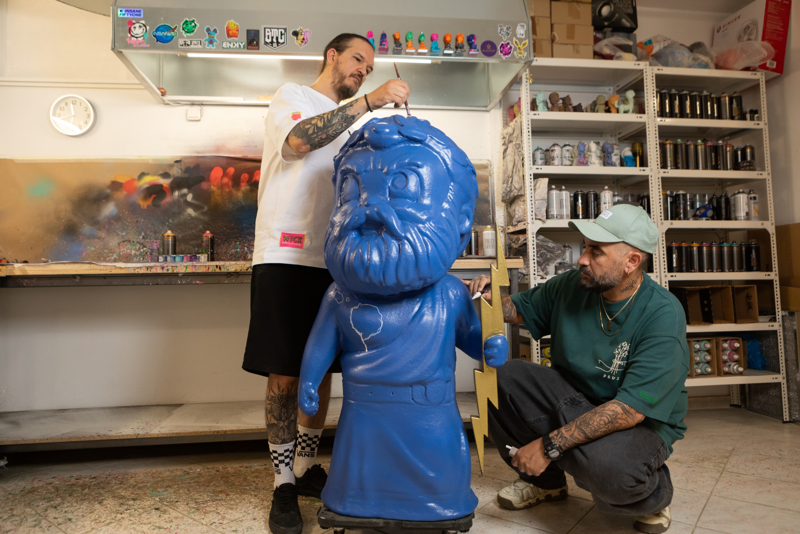 Στο εργαστήριο του Παλαιού Φαλήρου δηλαδή, όπου ο εικαστικός Παναγιώτης Βαλαής και ο graffiti και tattoo artist Sake δημιουργούν την πιο απενοχοποιημένη εκδοχή αυτού που για κάποιους μοιάζει με τουριστικό σουβενίρ, αλλά στην πραγματικότητα είναι ένα αντικείμενο τέχνης, το οποίο καταφέρνει έναν μοναδικό συγκερασμό: αντλεί ευφυώς αναφορές από την αρχαία ελληνική ιστορία και μυθολογία, αλλά φέρει σε κάθε χιλιοστό του το σήμερα.