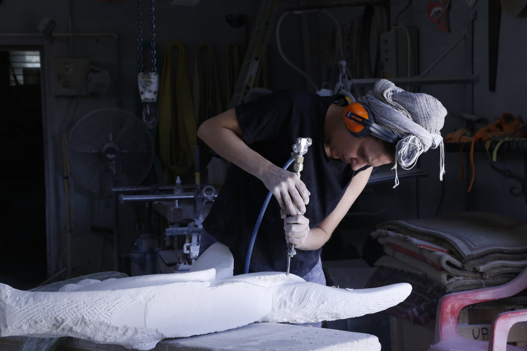 Η ανδροκρατούμενη τεχνική της λάξευσης, όπως την έχω διδαχθεί αρχικά από τον λιθοξόο και γλύπτη πατέρα μου, γίνεται πιο ρευστή, και η βιογραφία του υλικού της τοπικής πέτρας, άμεσα συνδεδεμένη με την πρακτική της δόμησης, τις γεωλογικές μετατοπίσεις αλλά και συμβολικά με τη γένεση του νησιού, αφήνεται να αφηγηθεί πολλαπλές ιστορίες επιβίωσης, συμβίωσης και ανθεκτικότητας σε ένα τοπίο ξηρασίας».