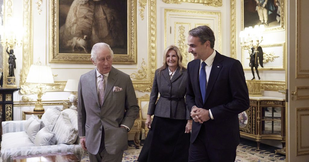 Τον περασμένο Νοέμβριο ο Κυριάκος Μητσοτάκης συναντήθηκε με τον Βασιλιά Κάρολο Β’ στο κάστρο του Ουίνδσορ. Παρούσα ήταν και η σύζυγος του έλληνα πρωθυπουργού, Μαρέβα Γκραμπόφσκι-Μητσοτάκη.