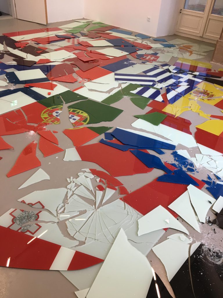 Μία από αυτές, η εγκατάσταση από σημαίες των χωρών-μελών της Ευρωπαϊκής Ενωσης αραδιασμένες στο πάτωμα, στήθηκε το 2017 για λογαριασμό της documenta στο Κάσελ, προκαλώντας πολλές συζητήσεις. Το έργο αυτό, «Ατιτλο» (ψηφιακή εκτύπωση σε γυαλί), κρίθηκε ιδανικό για να φιλοξενηθεί ως πρωτοσέλιδο στη μαθητική εφημερίδα «Το Βήμα της Ευρώπης», που κυκλοφόρησε μαζί με το «Βήμα της Κυριακής» πριν από περίπου έναν χρόνο (στο φύλλο της 12ης Μαΐου 2024).