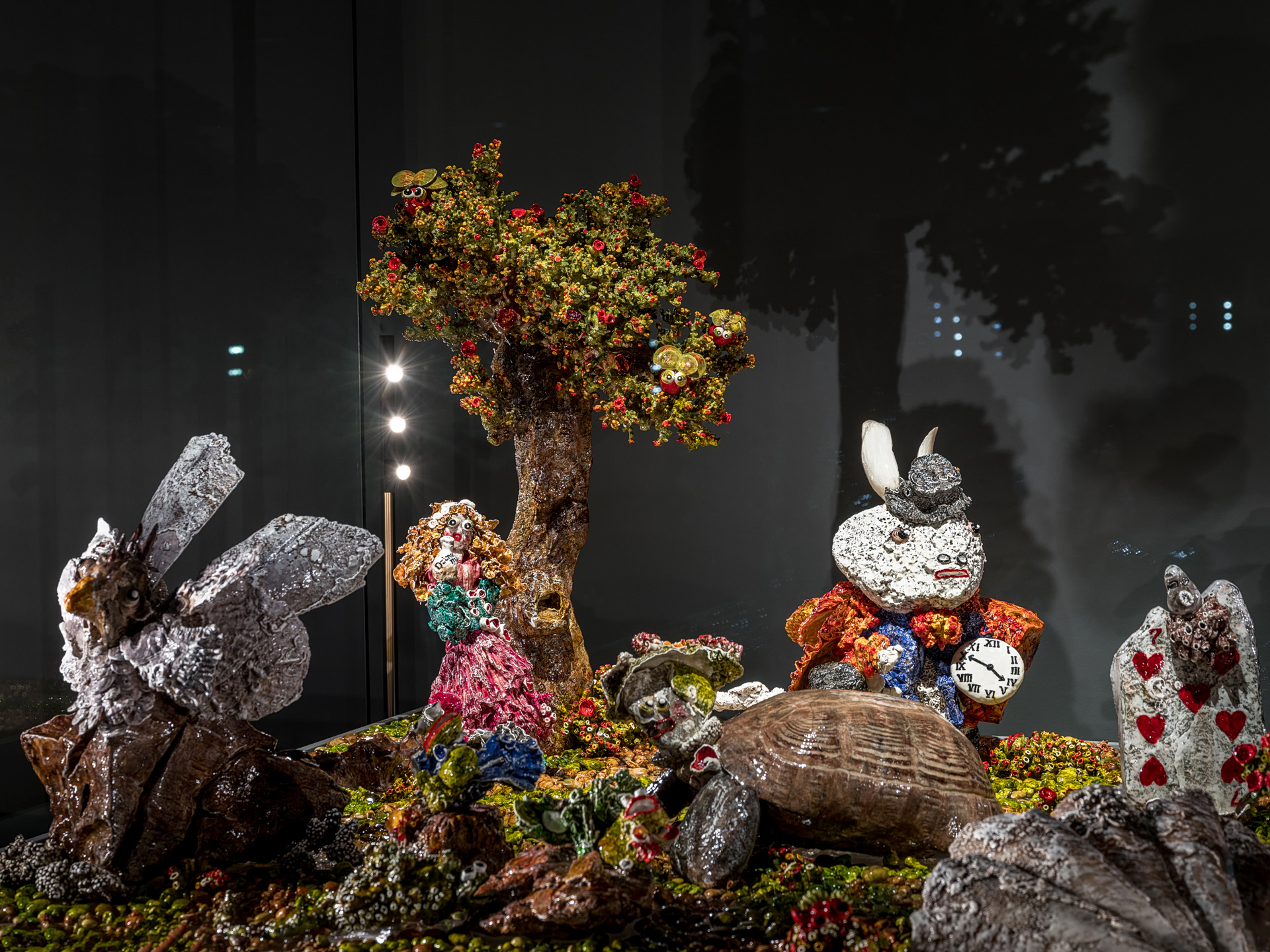 Καθώς περπατάμε ανάμεσα στα εντυπωσιακά και εξαιρετικά δουλεμένα στη λεπτομέρεια γλυπτά, η ξενάγηση μετατρέπεται σε μια βιωματική, από καρδιάς αφήγηση. Η δημιουργός κοντοστέκεται μπροστά στα έργα της, τα οποία αποκαλεί τρυφερά «τα σπλάχνα της θάλασσας». Για περισσότερα από 30 χρόνια, η ανάγκη της να στεγάσει αυτές τις «πέτρες νομάδες» την καθοδηγεί. Μου εξηγεί τη διαδικασία, και ξαφνικά το εργαστήριό της ζωντανεύει μπροστά στα μάτια μου: τα μικρά εργαλεία που σπάζουν και λιώνουν, οι σιδερένιοι τροχοί, το ευλαβικό πλύσιμο των υλικών για να φύγει το αλάτι αλλά να μείνει άθικτη η μνήμη του χρόνου. Η τελετουργία της δηµιουργίας αποτυπώνεται και σε ένα βίντεο που τοποθετεί τον επισκέπτη στο εργαστήρι της Παπαθεοχάρη. «Η πέτρα δεν παλεύεται» μου λέει αφοπλιστικά. Ανατρέχει στην ιστορία του πρώτου της έργου, του «Art Brutal», και την οδυνηρή αλλά απαραίτητη καταστροφή 48 έτοιμων, μεγάλης κλίμακας έργων στα πρώτα 13 χρόνια της μαθητείας της. Είναι συγκλονιστικό να ακούς έναν άνθρωπο να μιλάει για την τέχνη του όχι με όρους έπαρσης, αλλά με πνεύμα υποταγής στο πρωτογενές, πρωτόλειο υλικό. Κάθε κοχύλι, κάθε κοράλλι, κάθε φύκι που συλλέγει η ίδια περνάει από μια τελετουργική διαδικασία για να βρει τη θέση του στην αρχιτεκτονική αρμονία του γλυπτού της. Και έπειτα έρχεται το χρώμα – ένα χρώμα που, όπως λέει χαμογελώντας, «εκδικείται ανεπιστρεπτί αν δεν αρέσει στην πέτρα να το φοράει».