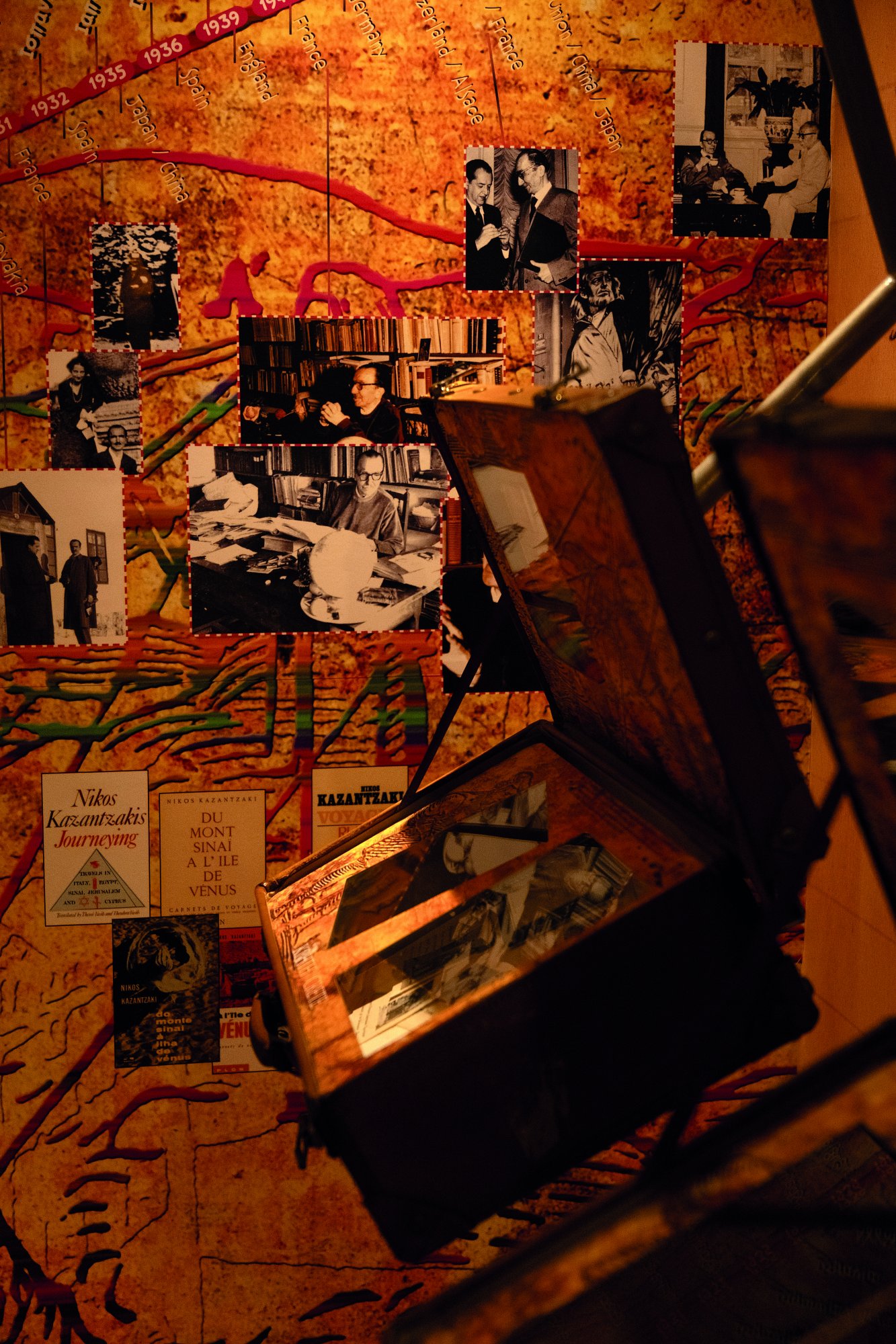 Προσωπικά αντικείμενα, φωτογραφίες και χειρόγραφα του Νίκου Καζαντζάκη εκτίθενται στις προθήκες του Μουσείου.