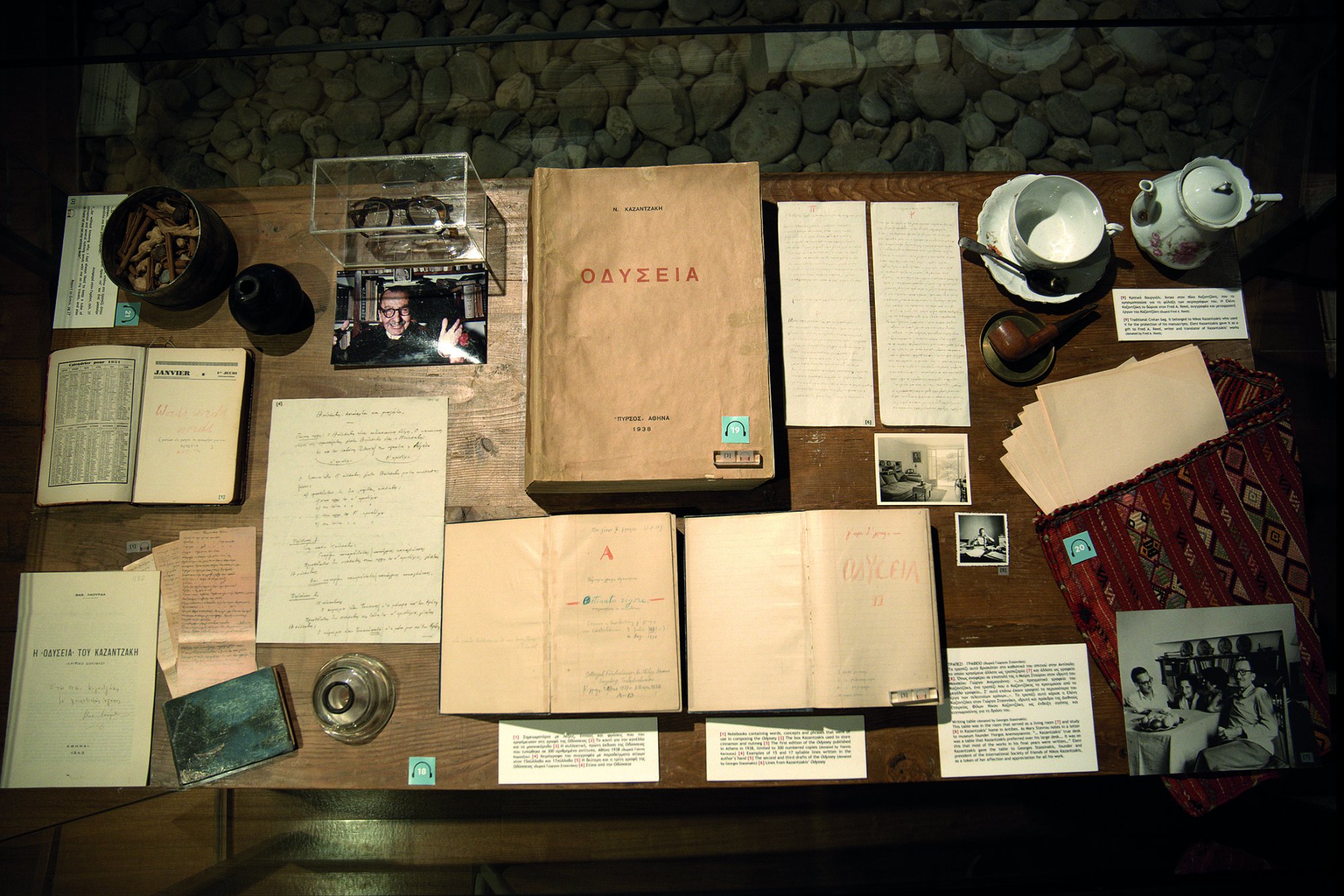 Υλικό από το μέγα έπος του Καζαντζάκη «Οδύσσεια» (στην πρώτη έκδοση του 1938, η γραφή είναι με ένα σίγμα, ως Οδύσεια) επάνω στο τραπέζι στο οποίο ο Καζαντζάκης έγραψε τα περισσότερα μυθιστορήματά του.