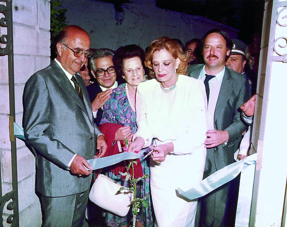 Στιγμιότυπο από τα εγκαίνια του Μουσείο Καζαντζάκη το 1983. Στην πρώτη σειρά, από αριστερά, διακρίνεται ο ιδρυτής του Μουσείου Γιώργος Ανεμογιάννης, η δεύτερη σύζυγος του Καζαντζάκη, Ελένη, και η τότε υπουργός Πολιτισμού, Μελίνα Μερκούρη.
